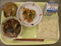 けんちんうどん・茎わかめとツナのサラダ・わかもちくんマフィン・牛乳