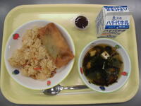 キムチご飯・ささみチーズ春巻き・豆腐とわかめのスープ・ひとくちぶどうゼリー・牛乳