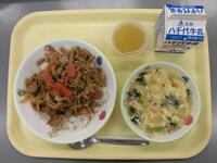 麦ごはん・プルコギ丼の具・ゆば入りかきたま汁・冷凍パイン・牛乳
