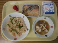 旬のたけのこご飯・鮭のマヨネーズ焼き・豚汁・いちご・牛乳