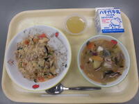 ごはん・さんが焼き(千葉県郷土料理)・のり和え・かきたま汁・市川のなしピューレゼリー・牛乳