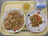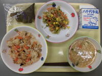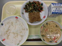 菜飯麦ごはん・和風サラダ・生揚げの肉みそ煮・りんご・牛乳