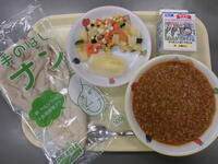 ナン・キーマカレー・マセドアンサラダ・りんご・牛乳