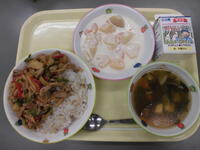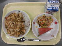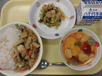 麦ごはん・焼き鳥丼(具)・ごま酢和え・豆乳杏仁フルーツ・牛乳