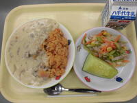 チキンライス・ドリアソース・アスパラとコーンのサラダ・メロン・牛乳