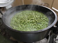 3年生がさやをもいだ枝豆は給食室の大きな釜で茹でました。