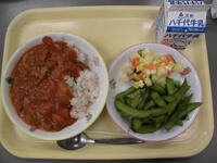 麦ごはん・ハヤシライス・マセドアンサラダ・枝豆・牛乳