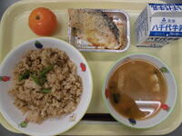 豚肉のしぐれご飯・鮭のマヨネーズ焼き・さつま味噌汁・冷凍みかん・牛乳