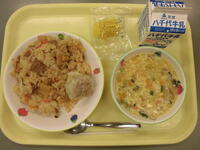 鶏五目ごはん・白身魚のコーンフレーク焼き・かきたま汁・りんご・牛乳