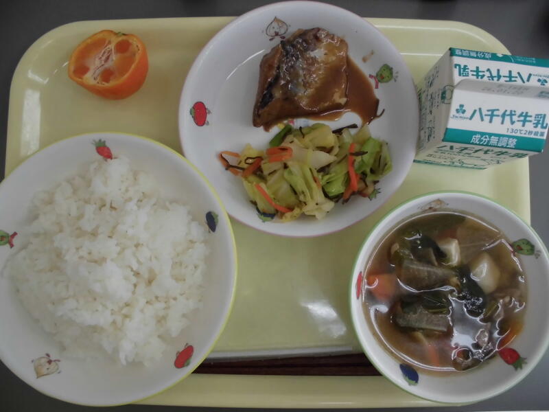 ・ごはん ・さばのみそ煮 ・即席漬け ・けんちん汁 ・みかん ・牛乳