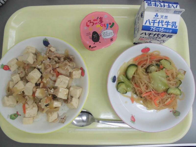 ・ごはん ・五目四川豆腐 ・春雨サラダ ・くろごまプリン ・牛乳