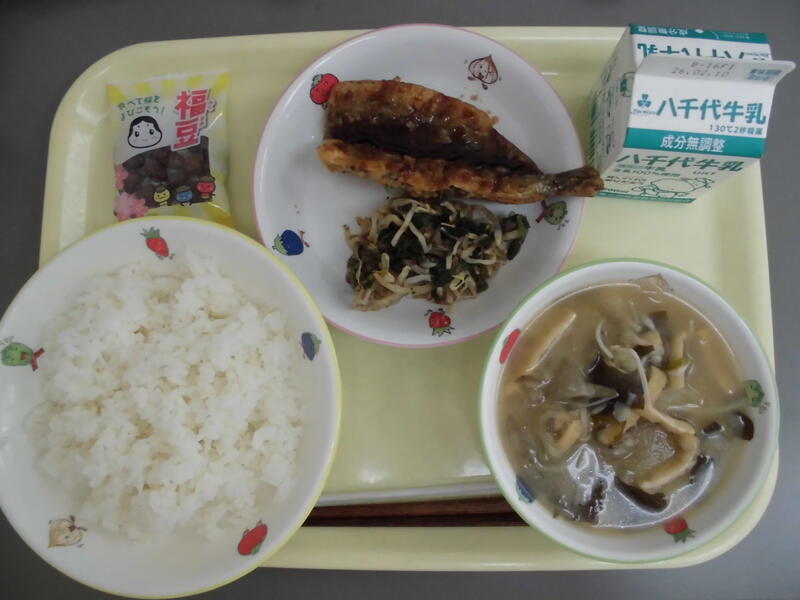 ・ごはん ・いわしのかば焼き ・梅かつお和え ・みそ汁 ・黒糖福豆 ・牛乳