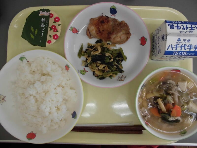 ・ごはん ・鶏肉の生姜焼き ・青菜の炒め煮 ・田舎みそ汁 ・抹茶ゼリー ・牛乳
