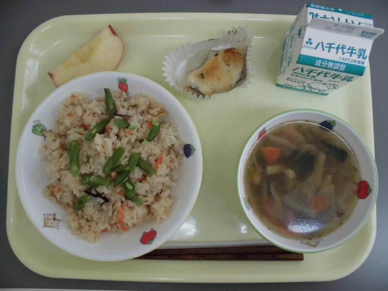 ・きつねごはん ・白身魚のみそマヨネーズ焼き ・のっぺい汁 ・りんご ・牛乳