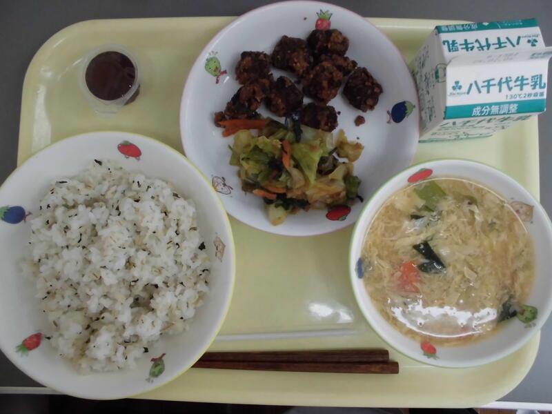 ・菜飯麦ごはん ・くじらの竜田揚げ ・おかか和え ・かきたま汁 ・ひとくちぶどうゼリー ・牛乳