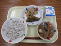 菜飯麦ごはん・サバのカレー焼き・しらたきソテー・だまこ汁