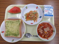 ガーリックトースト・ツナサラダ・ポークビーンズ・すいか・牛乳