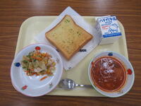 ガーリックトースト・焼肉サラダ・チリコンカン・牛乳