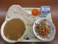 ナン・バターチキンカレー・こんにゃくサラダ・みかん・牛乳