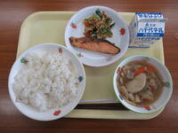 ごはん・鮭の塩焼き・納豆和え・すいとん汁・牛乳