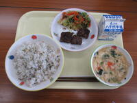 菜飯麦ごはん・くじらの竜田揚げ・おかか和え・かきたま汁・牛乳