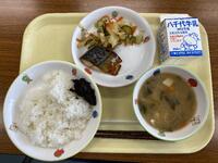 ごはん・市川産のりの佃煮・鯖の香味焼・胡麻酢和え・さつま味噌汁・牛乳