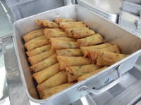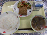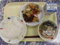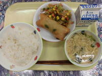 ごはん・春巻き・茎わかめとツナのサラダ・たまごスープ・牛乳
