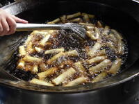 さつまいもとカボチャを入れたドーナツ生地を油で揚げて、