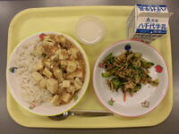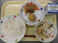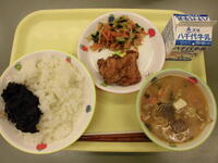 ごはん・行徳産海苔の佃煮・ハーブ鶏の竜田揚げ・小松菜のおひたし・千産千消豚汁・牛乳