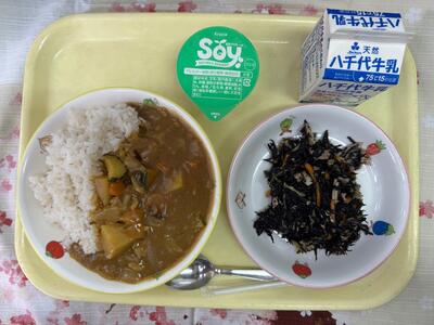 献立:ごはん、なつやさいカレー、ひじきのマリネ、とうにゅうアイス、牛乳