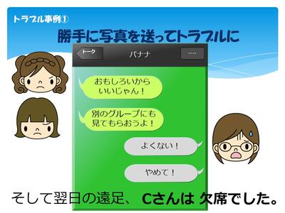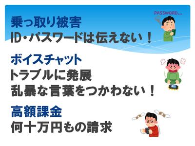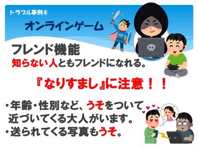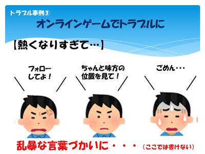 また、文字だけで行われるやりとりのトラブルの例や、オンラインゲームでのトラブルについてもお話がありました。市内でも、小学生がオンラインゲームによるトラブルに巻き込まれる例が起こっているそうです。