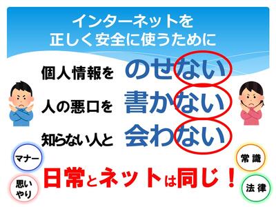 これから子どもたちが生きていく社会は、インターネットが欠かせない必需品となっていきます。学校、家庭でそれぞれに発達段階に応じて、安全に正しく付き合っていけるように教えていかなければなりません。最後に、保護者の皆様にお願いです。