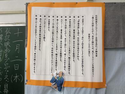 6年3組では、「一人の偉人について何冊も伝記を読み、伝記映画をプロデュースしよう!」を合言葉に本単元の学習を進めてきました。