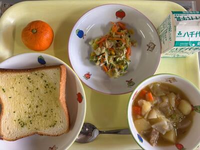 献立:ガーリックトースト・ポトフ・フレンチサラダ・みかん・牛乳