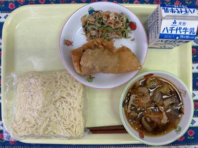 今日は、今年の読書月間中 最後のおはなし給食です。「ぎょうざが いなくなり さがしています」という本から「ジャンボぎょうざ」を作りました。大きくてもちもちした餃子の皮に、ひき肉と野菜をよく混ぜ合わせた肉だねをひとつひとつ丁寧に包んで揚げました。味わってくださいね。