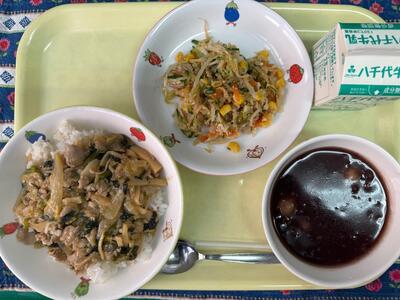 献立:ごはん・小松菜と豚肉のあんかけ・切り干し大根の中華和え・白玉汁粉・牛乳