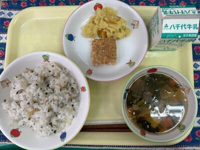 献立:わかめじゃこごはん・松風焼き・七草汁・洋風栗きんとん・牛乳