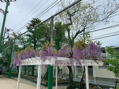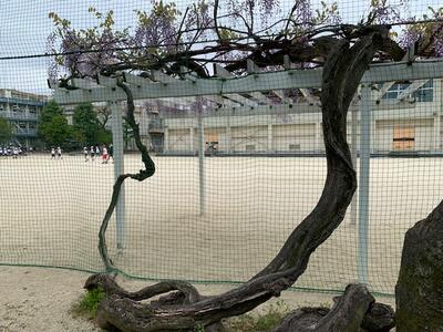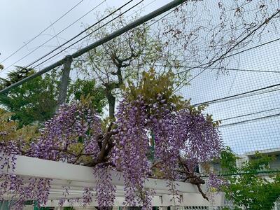 見事に咲いています。冬の間に、用務員さんが剪定(せんてい)をし、根っこに肥料を与え、大切に面倒を見てくれました。そのおかげで、今年はこんなにたくさんの花が咲きました。藤の花、木はどうなっているのでしょうか。