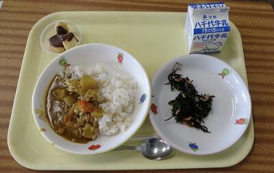 今日から1年生の給食が始まりました。初めての給食は、カレーとひじきのマリネです。