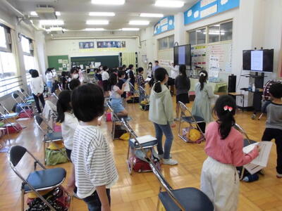 さて、こちらは、今日から始まった合唱部の体験入部の様子です。合唱部は3年生から入部することができます。今年も多くの申し込みがあり、4~6年生の先輩たちもはりきっていました。一緒に「Tomorrow」を練習しました。