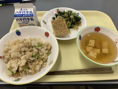 ○たけのこごはん ○まつかぜ焼き ○ほうれん草のからし和え ○すまし汁 ○牛乳