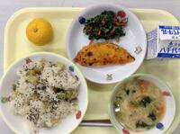 今日は秋においしい「さつま芋」を使った炊込みご飯、紅葉をイメージした「さけのもみじ焼き」、これからおいしい時期を迎える「みかん」と、目と舌で秋を楽しむ献立です。