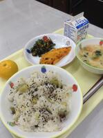 給食で使った食材のうち、お米、牛乳、のり、とり肉、こまつな、もやし、だいこんは千葉県産です。お米は「粒すけ」という、千葉県が13年かけて開発したオリジナル品種で、大粒で食感のいいお米です。また、のりの佃煮は、市川の行徳で採れたのりで作りました。