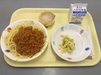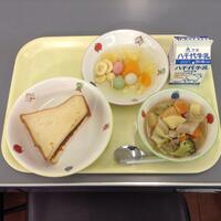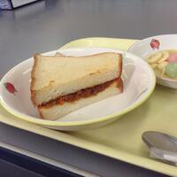 今日はパンにキーマカレーをサンドして焼いた「カレーサンドパン」です。カレーパンというと揚げて作るものが多いですが、なんとか給食でもカレーパンを出すことはできないかと考えて試行錯誤した結果、今日のように焼くかたちに落ち着きました。
