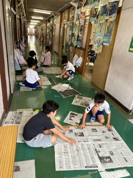 1aということは1㎡の新聞紙が100枚。4学級で分けると1学級25枚のノルマをこなさなければなりません。かなりハードなミッションですが、どの学級も集中して取り組み、すんなり100枚を超えてしまいました。