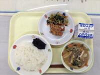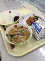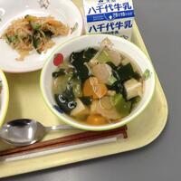 今日はちゃんこ汁です。「ちゃんこ」とは相撲の力士が食べる食事のことですが、一般的には鍋料理のことを指します。相撲部屋によっていろいろな味がありますが、八幡小では手作り鶏団子を入れてみそ味に仕上げました。肉や野菜がたくさん入っていて栄養があり、体も温まります。