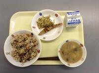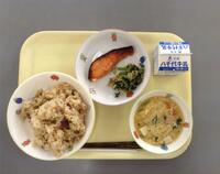和食の日にちなみ、給食でも栗・さつま芋・しめじなど秋の味覚がたくさん入った「ふきよせごはん」と、発酵食品のみそで下味をつけた「鮭の西京焼き」、けずりぶしと昆布で丁寧にだしをとった「かきたま汁」を作りました。