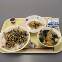 三色そぼろ丼は、肉そぼろといりたまご、小松菜の和え物を別々に作ってから和えました。本当は別々に盛り付けたいところですが配膳しやすいように給食室ですべて和えて提供しています。