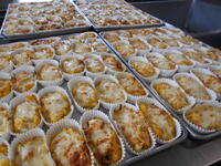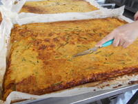 ↓「やきとりどん」のねぎを油でまぶしオーブンで焼くために鉄板に並べます