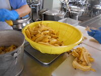 ↓揚げ終わったら食缶にちくわとさつまいもを入れます